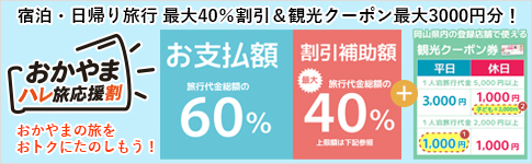 一つの旅行につき旅行代金総額の最大40%割引&最大3,000円の観光クーポンがセットになった『おかやまハレ旅応援割』は2022年12月20日まで!